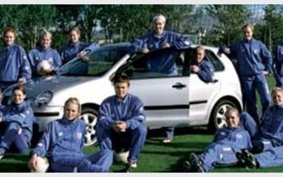 Kvennalandsliðið í knattspyrnu áritar veggspjöld frá Volkswagen